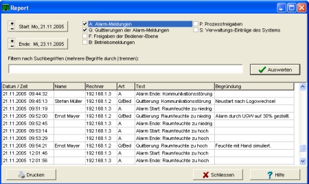 Das Audittrail kann über die Reportfunktion, gefiltert nach verschiedenen Kriterien, ausgedruckt werden, siehe als Bsp. Alarmprotokoll.