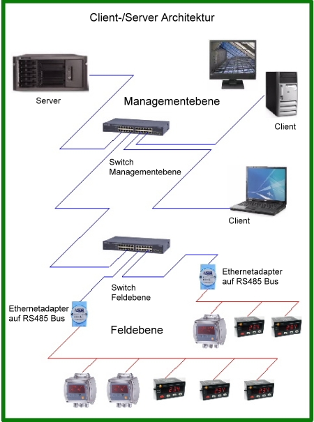 ![]() Schema als Beispiel für eine Client-/Server Anwendung bei der die Messdaten aus dem Feld lokal über eine Ethernetankoppelung zentral auf dem Server abgespeichert werden. Über die angeschlossenen Clients wird der Prozess online kontrolliert, bedient und die Daten ausgewertet. |