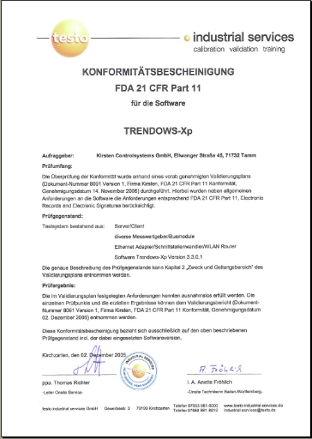 Konformitätszertifikat der Trendows-Xp Validierung nach den Anforderungen der FDA 21 CFR Part 11.